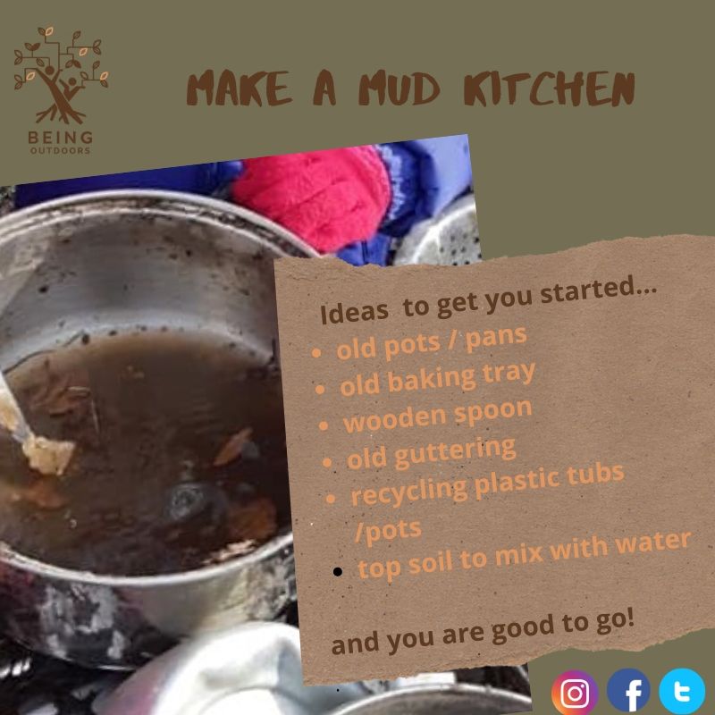 The is for all those children who are missing their muddy Forest School fun! Just grab those pots, pans, cutlery and containers that you don’t use from the cupboards, find a space where you can access top soil and mix with water to get your mud!