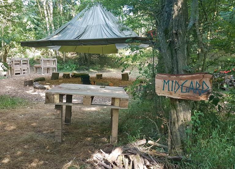 Woodland workshop – a sheltered space in a quieter area of Shield Tree Wood, perfect for facilitating woodland craft projects or develop tools skills.